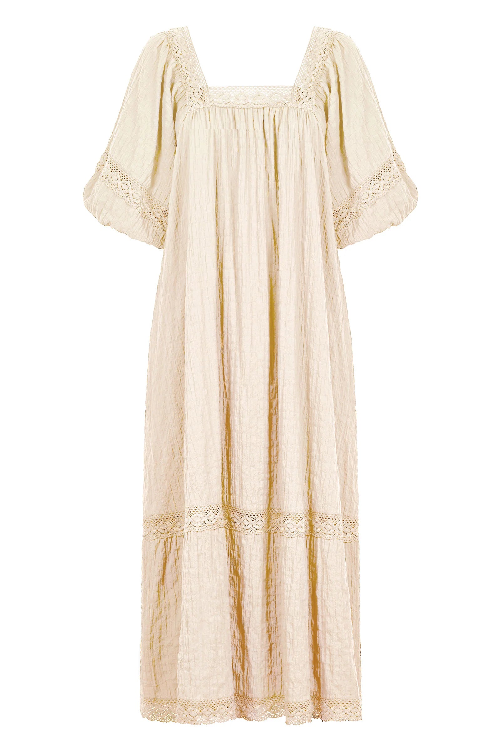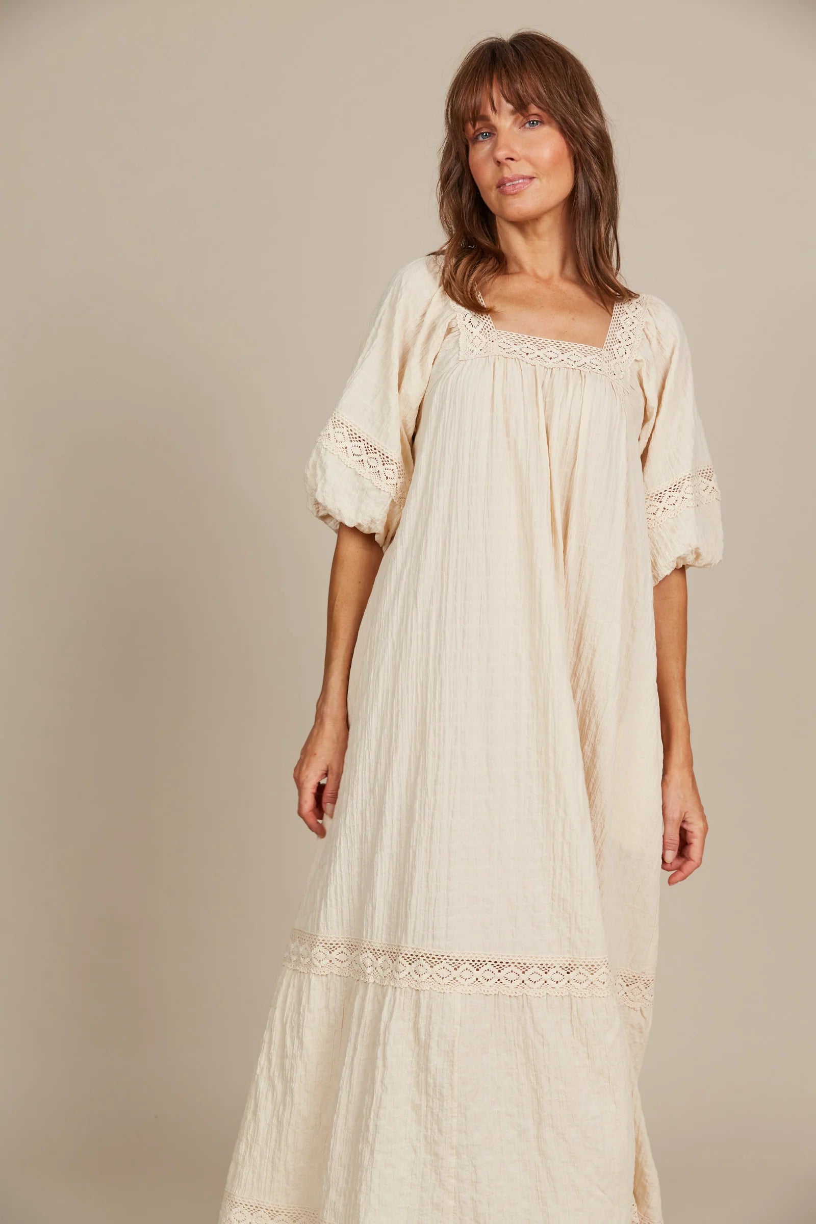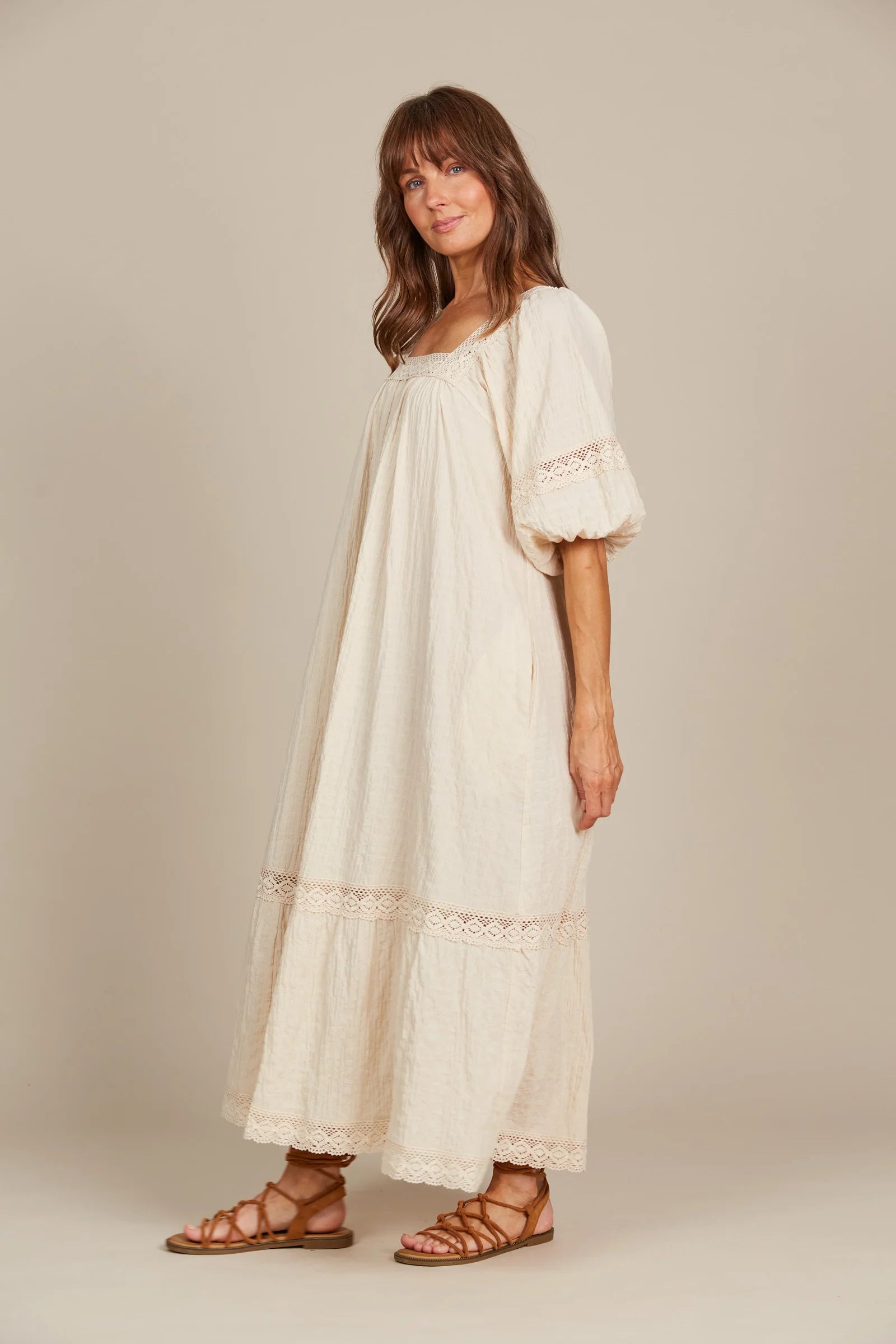 For those Sunday mornings at the market or days filled with errands, the Fleur Maxi is your go-to dress. With its relaxed fit and comfortable textured cotton blend, this maxi is effortless to wear. Lovely lace trimmings highlight the square neck, bishop sleeves, and hem, infusing the dress with a gentle, feminine charm. Slip into slides, grab a tote bag, and you're ready for the weekend!